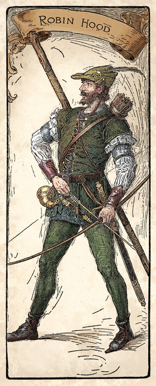 Robin Hood, who was been played in films by many famous actors including Sean Connery, Kevin Costner, Russell Crowe, Douglas Fairbanks, Errol Flynn and Richard Todd, is a England folklore outlaw, who after returning from the Crusades rebelled against King John, who had claimed the throne from the absent Richard the Lionheart. King Richard being in the Holy Lands fighting the Crusades. Living in Sherwood Forest, Robin and his Merry Men tried to rescue Robin's lover, Maid Marion, from the Sheriff of Nottingham who had her locked up in his castle. Robin and his Merry Men, which included Friar Tuck, Little John, Alan-a-dale and Will Scarlet, are also famous for robbing the rich to pay the poor.